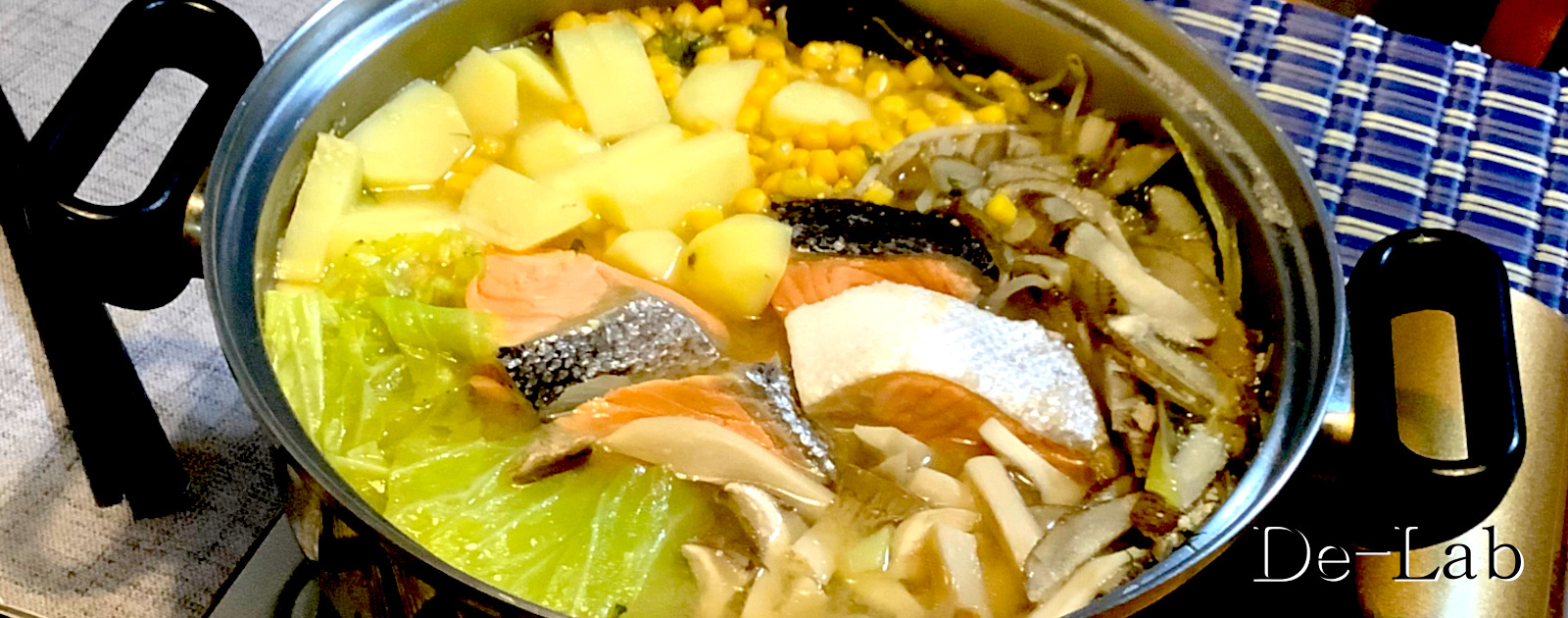 Arrange the vegetables, mushrooms, and tofu in a pot. Place the salmon and corn on top.
