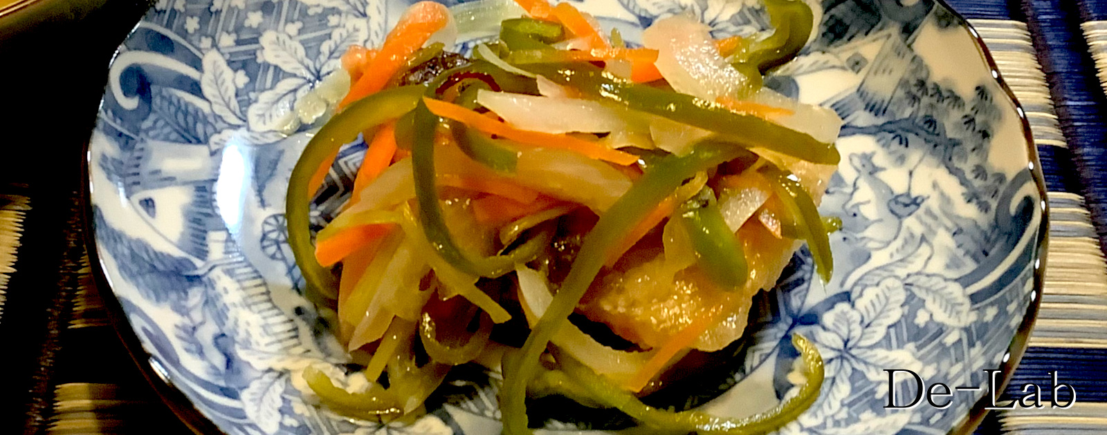 人参、玉ねぎ、ピーマンの順で炒め軽く塩胡椒をして南蛮酢を入れる